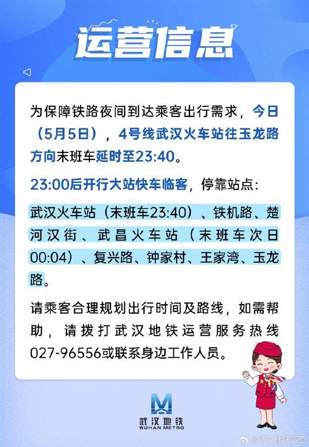 湖北日报讯(记者成熔兴、通讯员李丹、产启斗)5月4日,武汉地铁运营有限公司官方微博账号发布运营信息表示,为保障铁路夜间到达乘客出行需求,5月5日,4号线武汉火车站往玉龙路方向末班车延时至23:40。