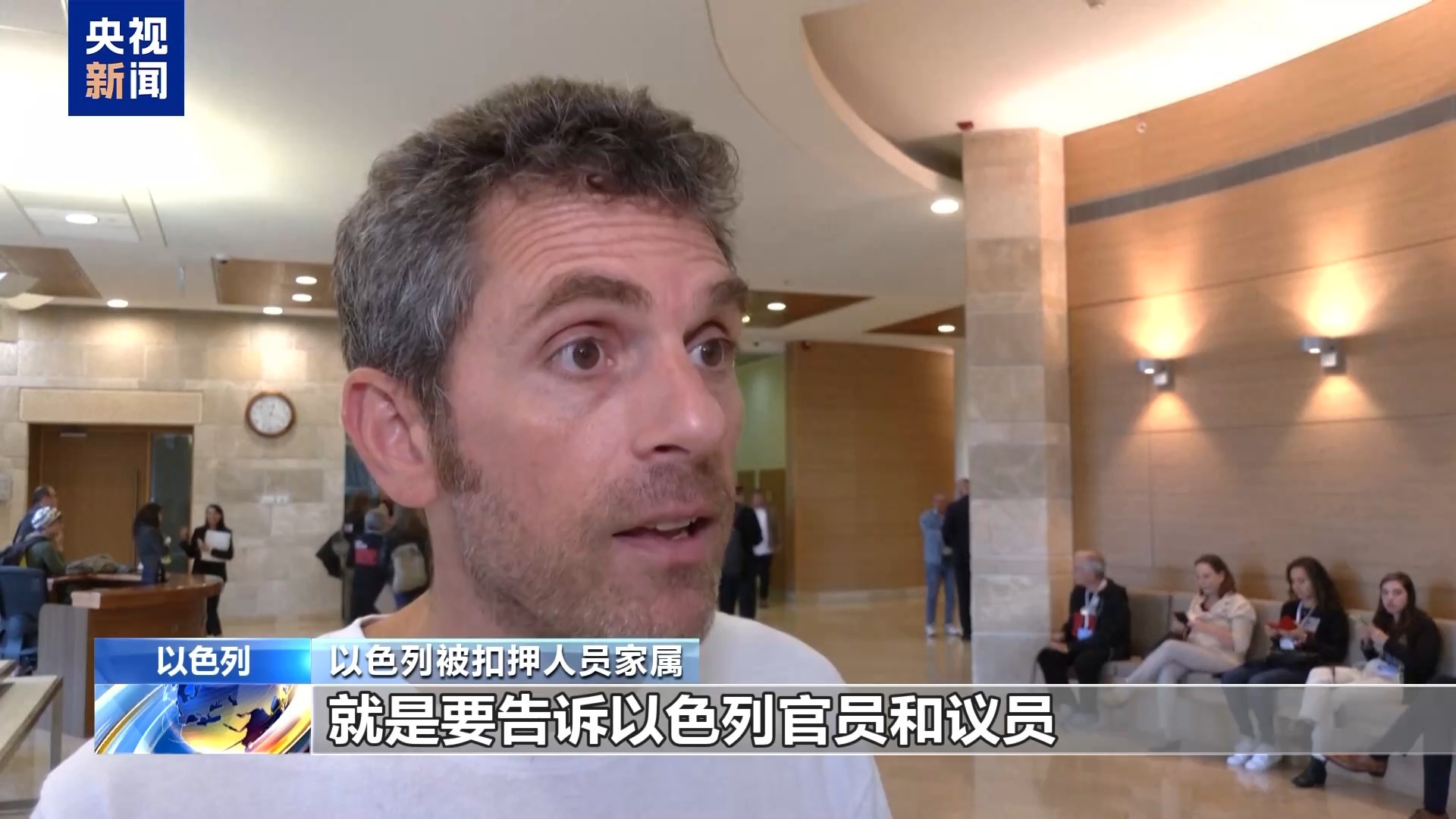 以色列被扣押人员家属:我们今天来到以色列议会,就是要告诉以色列官员和议员,让他们知道大多数以色列人是怎么想的。毫无疑问,大多数以色列人都知道让被扣押人员获释才是当务之急。