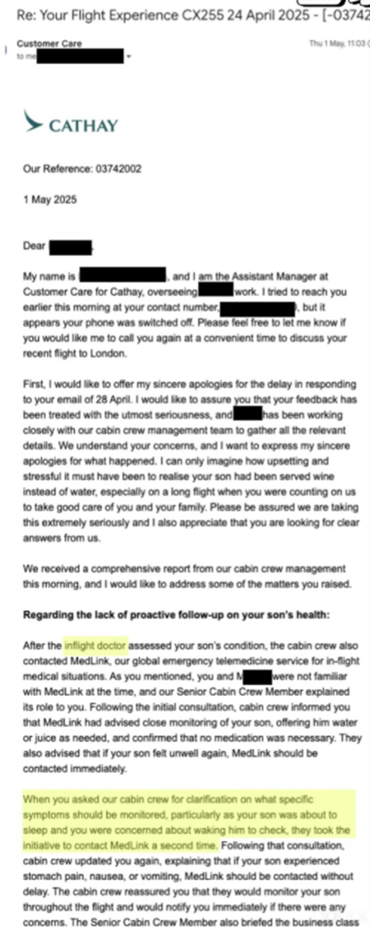 国泰航空企业事务部表示,“航机抵达后,有关乘客及其家人已如常离开机舱。国泰航空高度重视此次事件,并立即启动内部调查,确保采取适当的跟进行动,并已提出补偿方案。我们会继续向乘客及其家人提供适切的支援。”