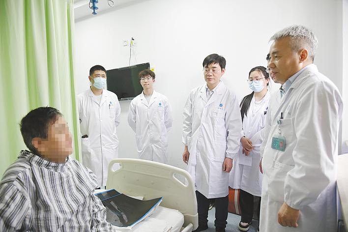手术后,杨操教授(右一)为张美查房。(湖北日报全媒记者 龙华 通讯员 陈有为 摄)