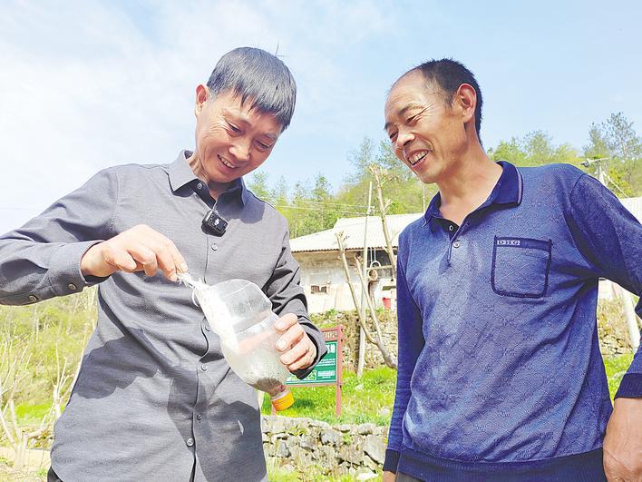 严高红(左)向农户传授养虫经验。 (湖北日报全媒记者 张泽牧 摄)