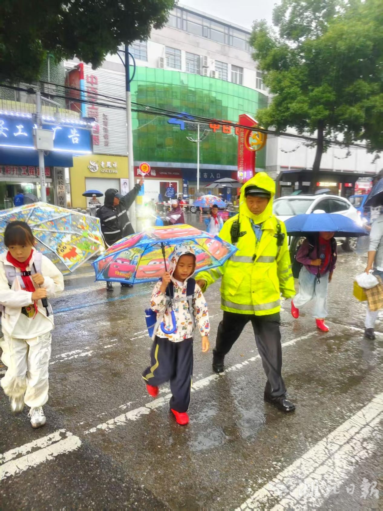 中山大道利济路口一头连着市一医院,一头连着红旗村小学,车流量很大。民警杨彬和快骑队员李小雄一直在路口冒雨疏导,雨衣里面的制服都湿透了也顾不上歇会。解放大道汉西路口,直行车流和掉头车流相互交织,稍不注意就容易造成拥堵,三中队快骑队员汪卓、苏应芳一直在雨中指挥两股车流交替通行,力保道路畅通。