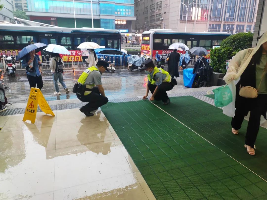 武汉轨道公安在地铁2号线出入口铺设防滑垫。通讯员供图