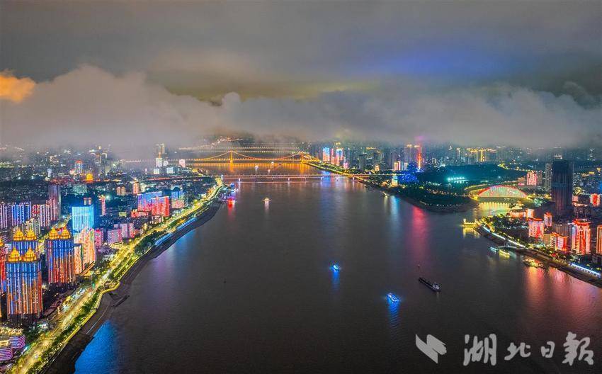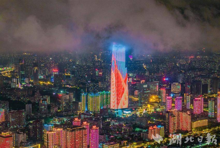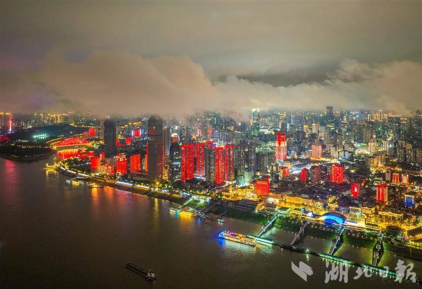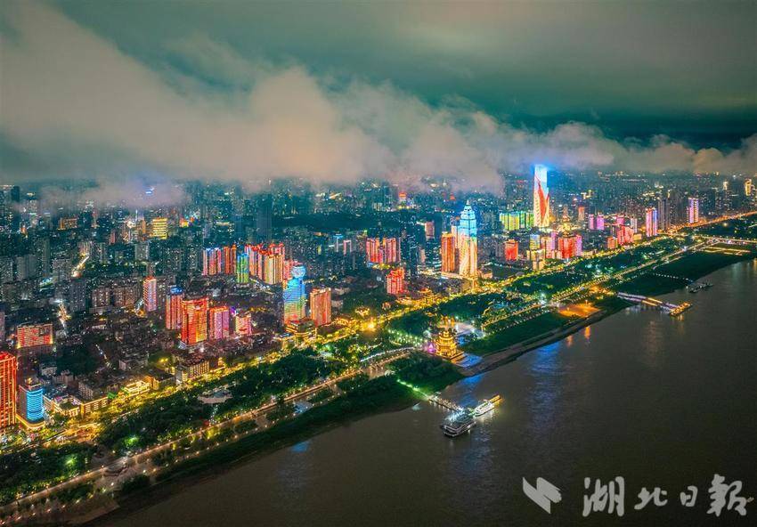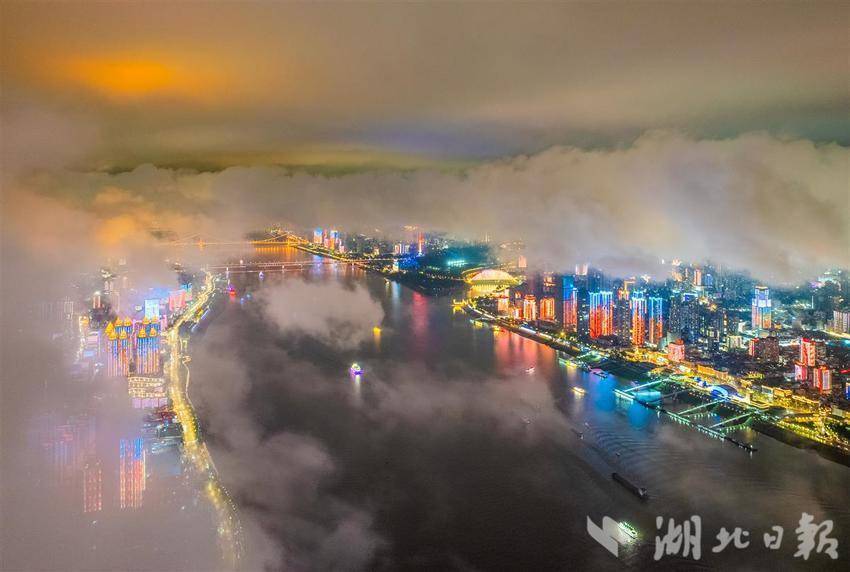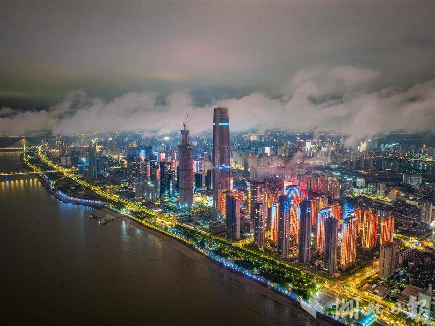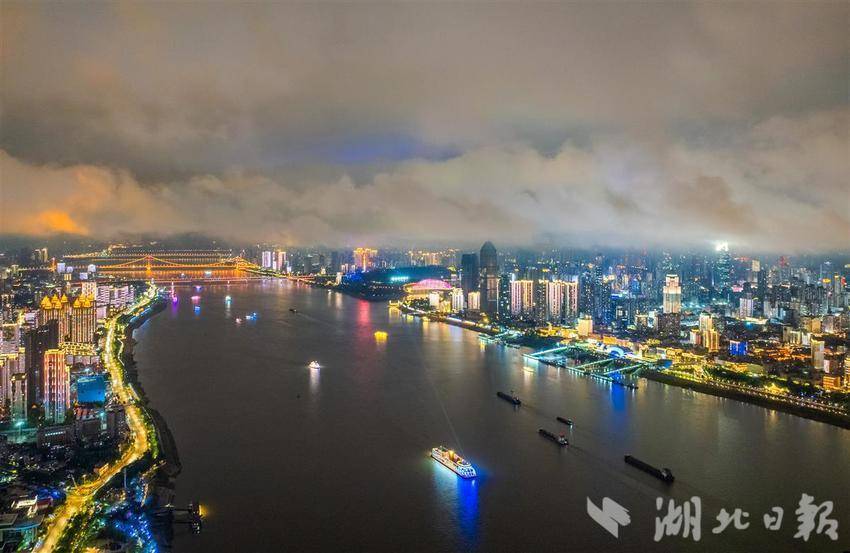 5月8日晚,暴雨过后,平流雾笼罩在武汉城市上空,与城市灯光建筑交相辉映,宛如仙境。(湖北日报全媒记者 柯皓 摄)