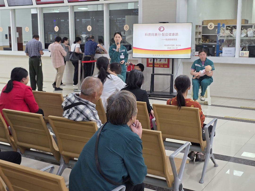 这场生命的接力赛,最终以患者转危为安告捷,也触发了医院开展全民急救培训的决心。荆州市中医医院急诊科以此为契机,在门诊大厅开展了一场以“科普同裹行·智启健康路”为主题的急救技能普及宣教活动,活动现场气氛热烈,吸引了众多群众踊跃参与。