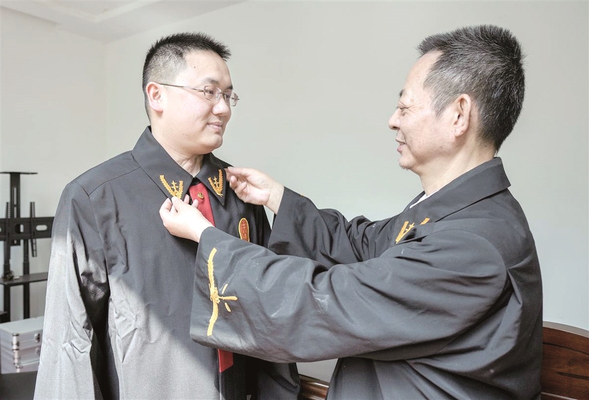 自己的徒弟第一次开庭,刘海涛还送来一份特殊的“礼物”—一件自己穿过多年的法袍。“希望你穿上这身法袍后,能够做一名有韧劲、有尺度、有温度的法官。”