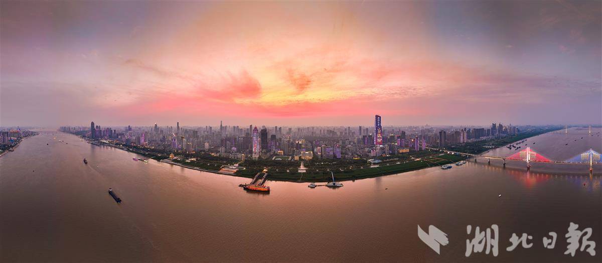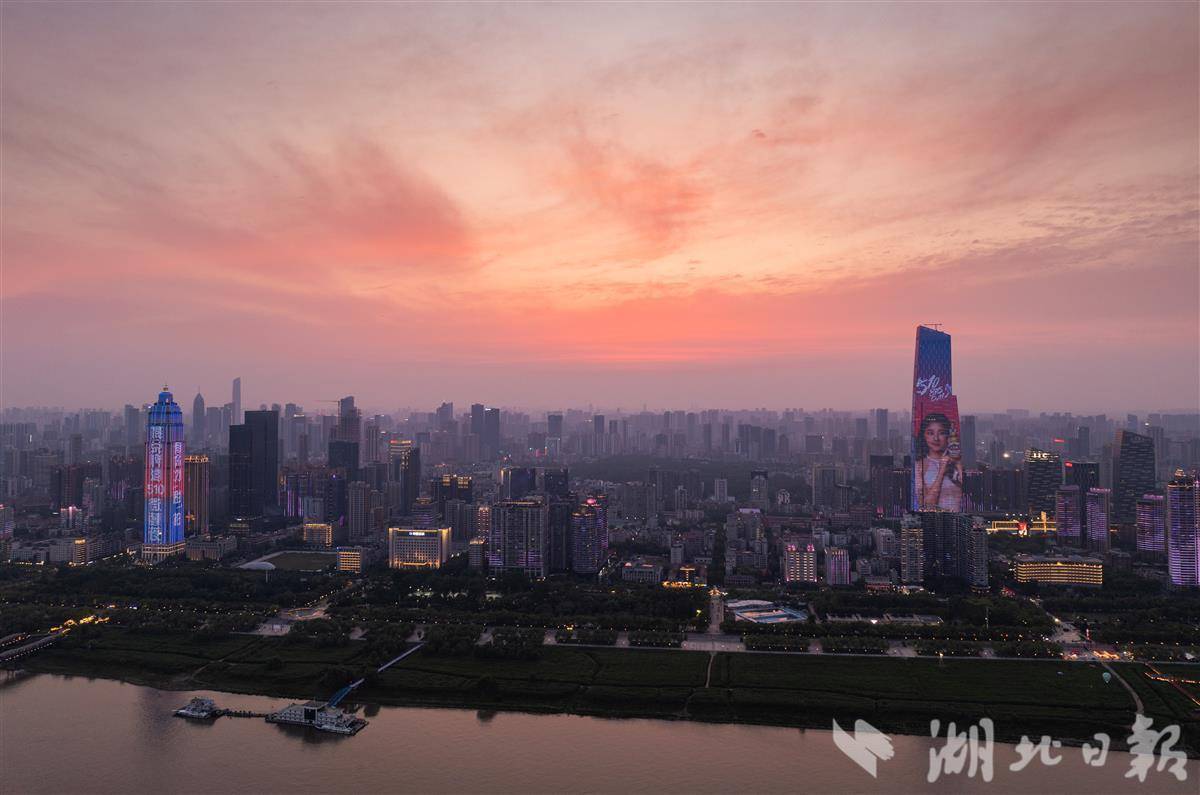 5月10日傍晚,武汉天空出现绚丽晚霞。美丽晚霞掩映下的城市格外美丽。(湖北日报全媒记者 柯皓 摄)