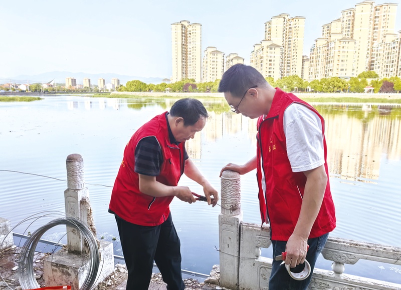5月9日,广水市学雷锋志愿服务队队员发现广水城区部分河岸护栏遭损坏,出现断裂、倾斜,存在较大安全隐患。为确保市民安全,队员采购铁丝、警示牌等工具,对破损护栏进行应急加固,并设置警示标志,提醒过往行人注意安全。 (随州日报通讯员高晓涵、韩晓清摄)