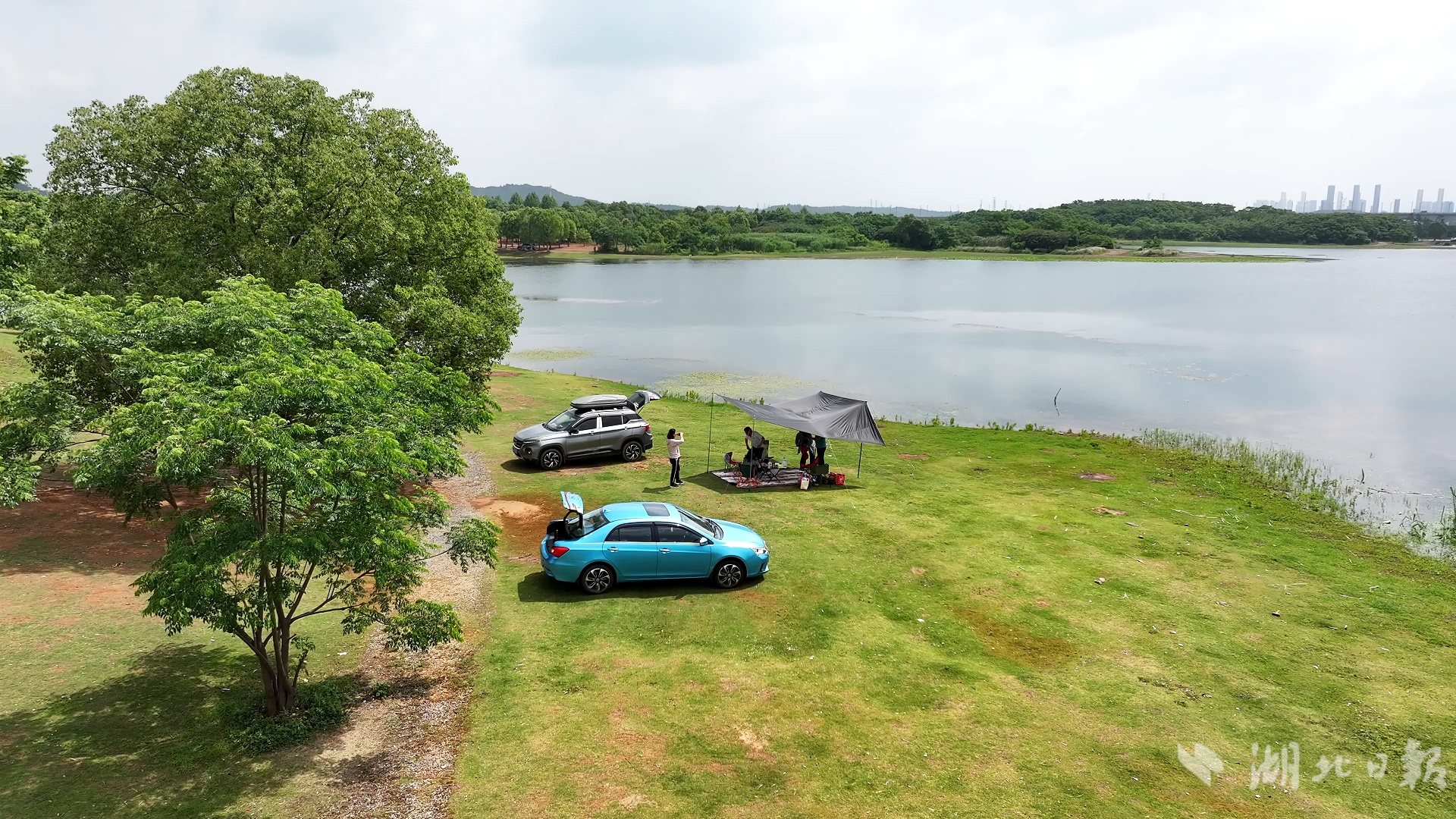 5月9日上午,武汉经开区牛尾湖边,京港澳高速公路上车流如织,车谷大桥横跨湖面,高速公路、快速路平行穿过这片水系。岸边,一顶顶帐篷和天幕里,大人们悠闲地聊着天,小朋友在草地上撒欢奔跑,从空中俯瞰,汇聚成一幅五颜六色的生动图景。