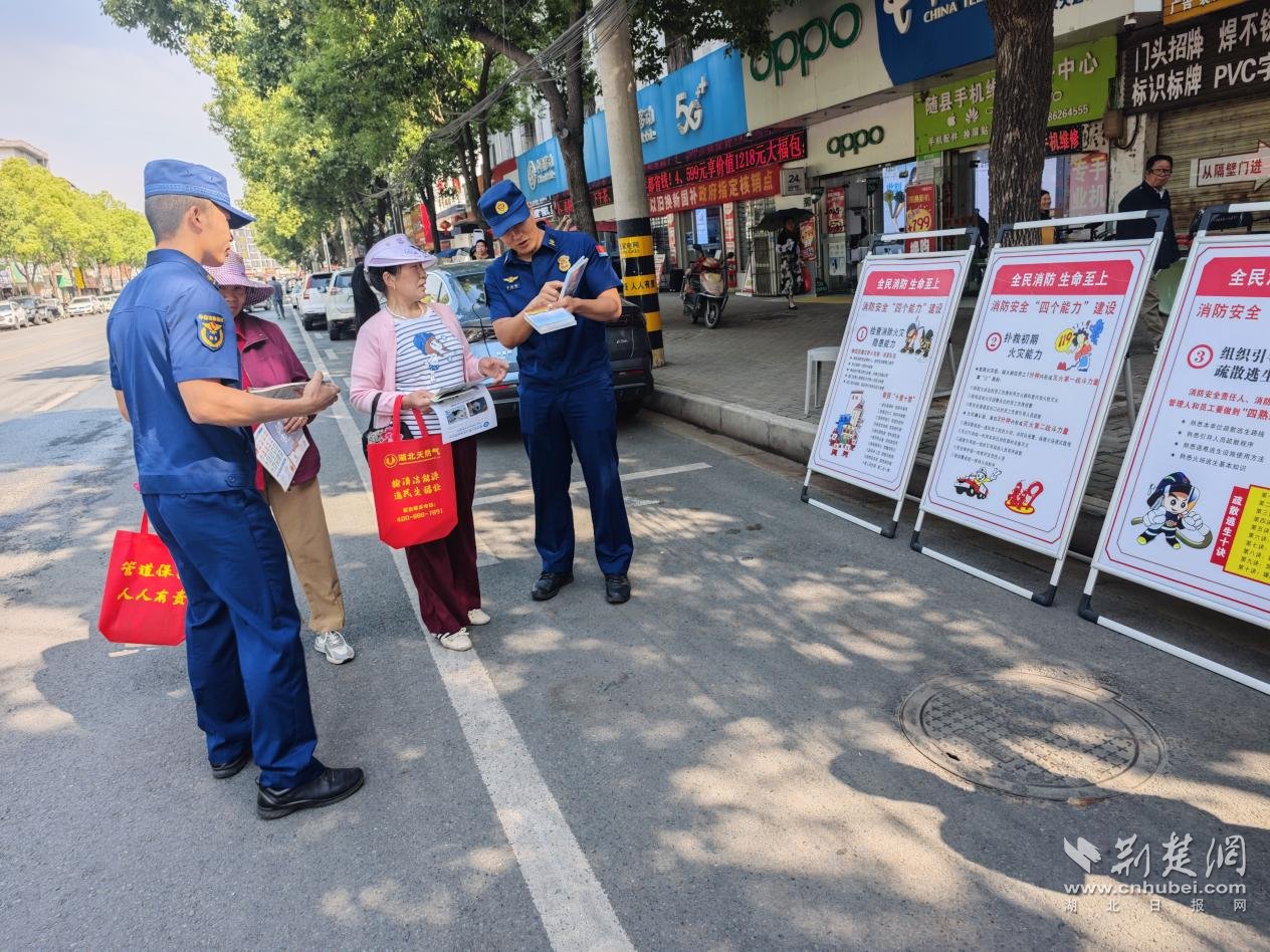 随州市消防人员正在为来往市民发放并讲解消防宣传手册。杨圆圆 摄