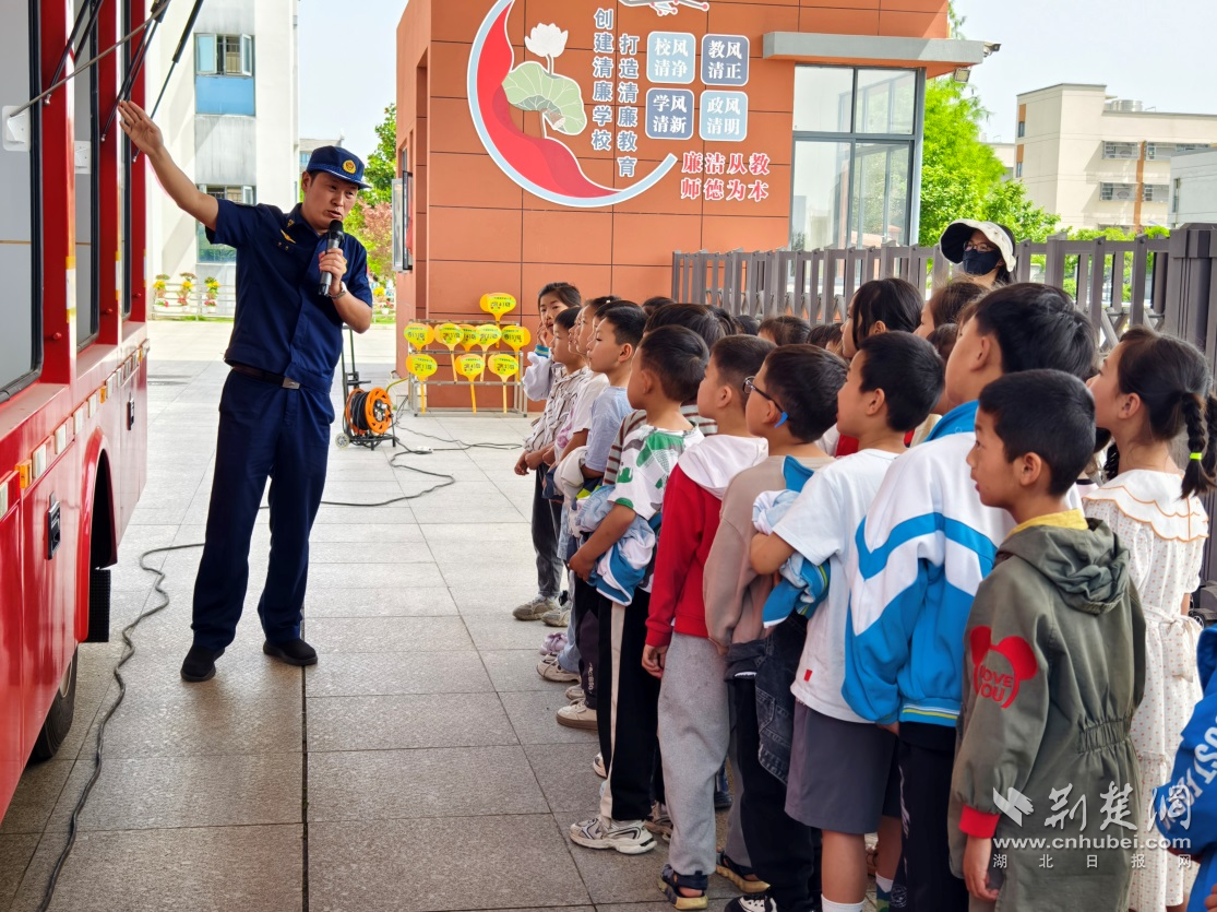 荆门市钟祥市消防救援大队宣传员带领学生参观了解宣传车。 刘恋 摄