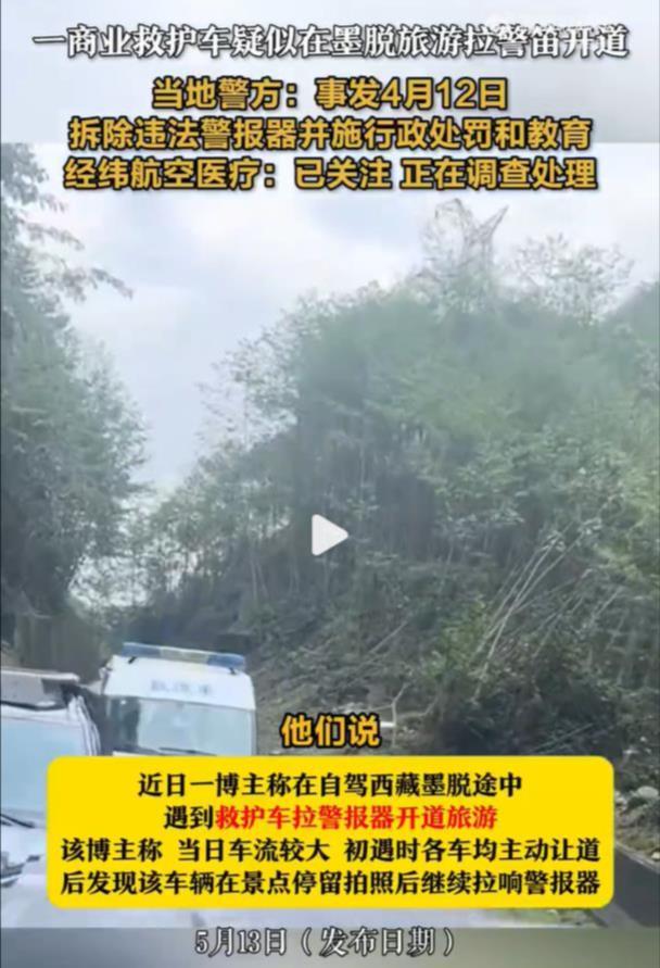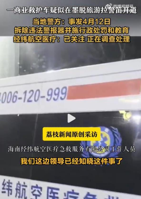 对此,当地警方回应称,事发于4月12日,已拆除违法警报器并实施行政处罚和教育。该救护车身上显示的海南经纬航空医疗急救服务有限公司也表示,已关注此事,正在调查处理。(据5月13日荔枝新闻)