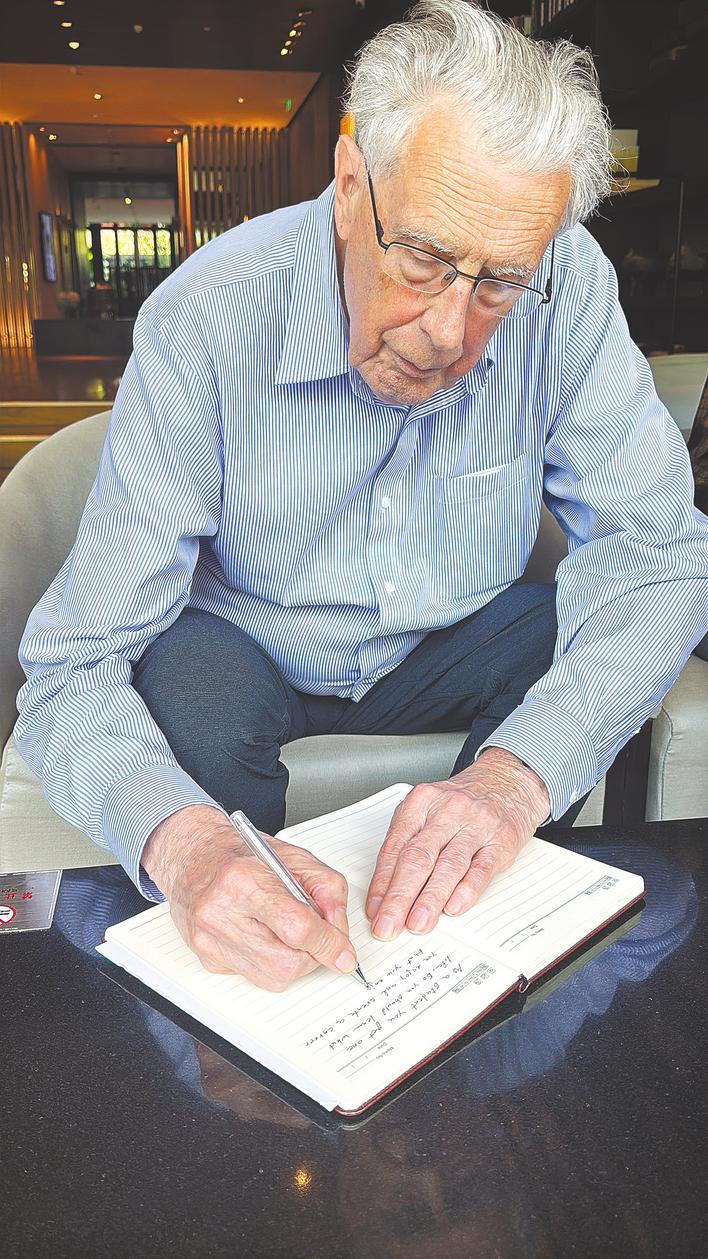 约翰·霍普克罗夫特给中国学子写寄语。 (湖北日报全媒记者 王理略 摄)