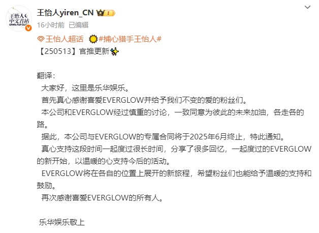Everglow成员王怡人13日转发公司公告,公告内容称,“本公司和EVERGLOW经过慎重的讨论,一致同意为彼此的未来加油,各走各的路。据此,本公司与EVERGLOW的专属合同将于2025年6月终止,特此通知。”