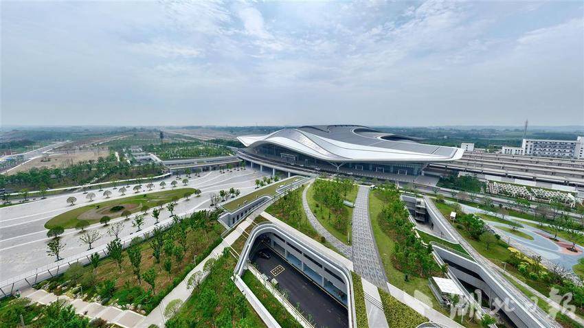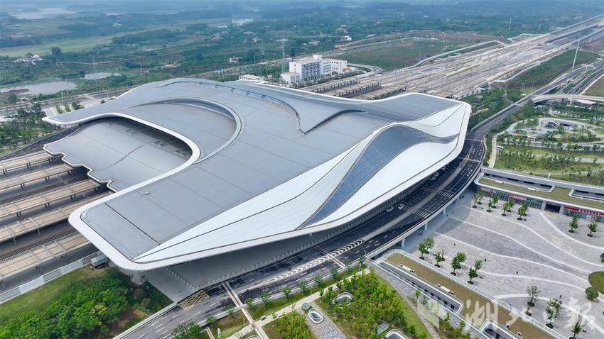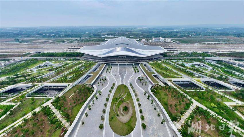 5月14日,雨霁初晴,湖北荆门西站银灰色站房仿佛即将翱翔长空的“钢铁之翼”,在阳光映照下展露锋芒。