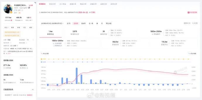 据第三方数据平台显示,李亚鹏近30天直播带货总销售额在1000万至2500万元。新增粉丝1.4万,目前总粉丝数在517.5万。其账号1-20秒视频报价为3.8万,21-60秒视频报价为5.1万,60秒以上视频报价为7万。