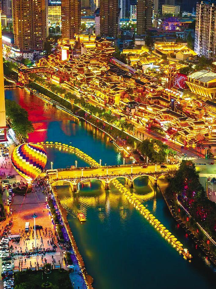 穿过惹溪街,映入眼帘的便是五彩斑斓的大型热气球。游客进入热气球的吊篮里,随着气球缓缓升空,两岸灯光璀璨,河中波光粼粼,宣恩城的繁华与宁静夜景尽收眼底。
