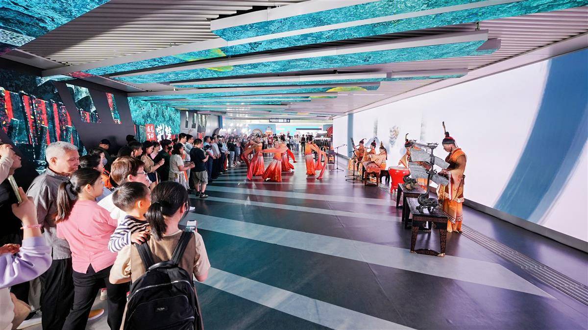 站厅换乘品牌社区内,更是别有洞天。百件荆楚瑰宝的高清影像精心排列,构成了一条长达百米的数字文化长廊。每一件文物旁都贴心设置了“荆楚瑰宝”文博码,拿出手机轻轻一扫,即可进入线上展厅,获取文物的3D高清扫描图片、AI音频讲解以及精彩视频资料,沉浸式体验“一码穿越千年”的奇妙感受。