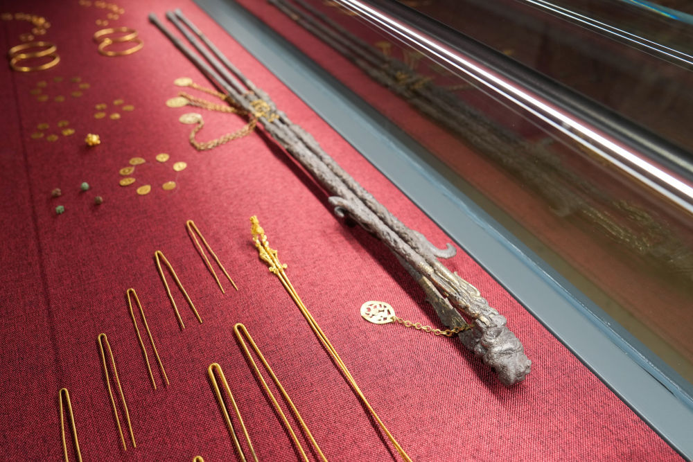 记者在博物馆内看到,这座砖室墓平面为十字形结构,占地约150平方米,长约15米,宽约10米,大墓出土文物一同陈列于旁,包括58件金器、4件铜器及若干件瓷器,其中一件龙首金钗吸引不少参观者的目光。这根金钗长26厘米,重27.1克,顶端为一龙首,用细金条、金片、炸珠等勾勒出眼睛、耳朵、角等,工艺精湛、栩栩如生,其与另一件展陈在苏州博物馆的凤首金钗为一对,属于较为少见的孙吴王室高等级金器,考古人员判断其主人是一位地位较高的年轻女性。