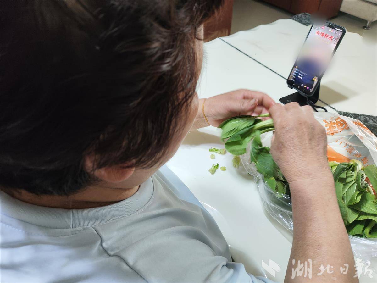 63岁的马婆婆一边择菜一边看老年人养生直播。(湖北日报全媒记者 李光正 摄)