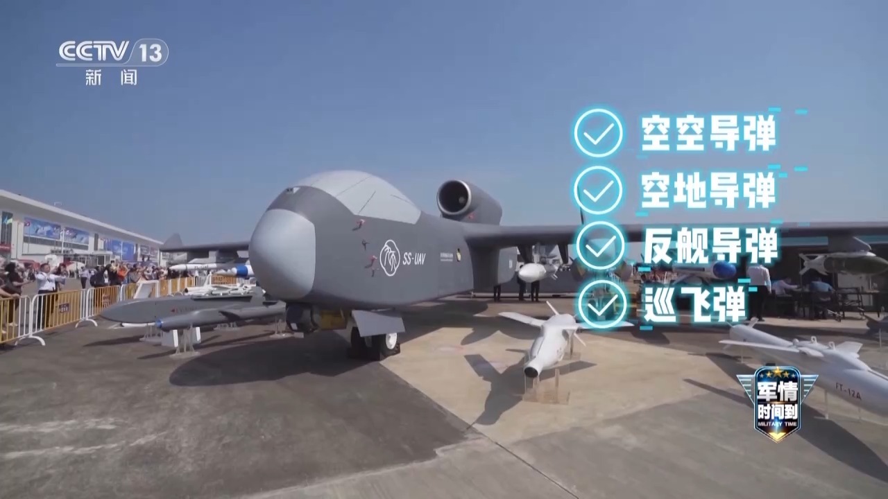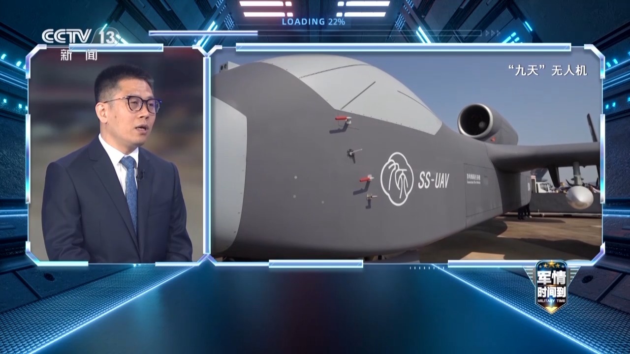 专家:“九天”无人机在进行作战的时候,可以携带多元化的载荷。一方面可以搭载进攻性的武器,比如说它有这个挂架,其中四个挂架可以挂载一吨的载荷,你像一吨的载荷,这样的导弹就非常大了。在中国航展上,我们可以看到它也可以挂载这种防区外发射导弹。这种导弹一打就会打好几百公里,而且还可以进行隐身突防,威力非常大。它还可以挂载一些小型的无人机。可以说目前的对地打击载荷它基本上都能挂载。而且在中国航展上我们也看到它可以挂载中距的空中导弹。比如说霹雳-12E。那么导弹既可以进行自备,也可以对对方的空中目标进行先敌发射、先敌打击。我觉得更重要的是,如果它搭载了比较先进的电子战吊舱,那么可以压制对方的雷达、干扰对方的雷达,提高自身的生存能力。那么如果说能够搭载定向红外干扰系统,通过激光束去干扰对方的红外制导导弹,可以极大地提高它的生存能力。所以它那么高的挂载能力可以挂载多元化的武器。既可以提高它的突防打击能力,也可以提高自己的生存能力。