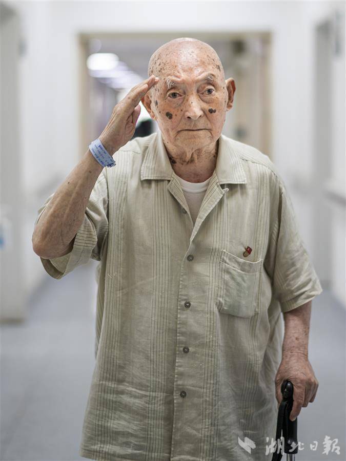 5月19日,在华中科技大学校医院,武汉百岁抗战老兵宋绍瑛敬军礼。
