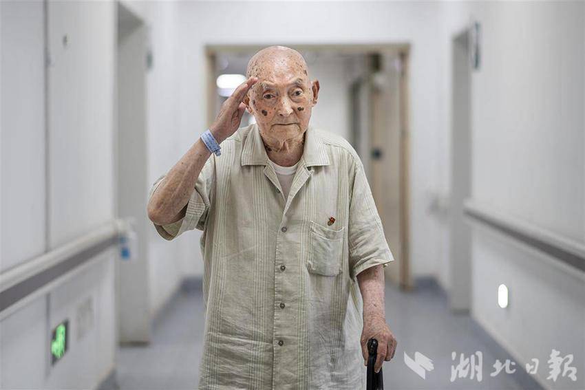 5月19日,在华中科技大学校医院,武汉百岁抗战老兵宋绍瑛向记者讲述起参加抗日战争的峥嵘岁月。1925年,宋绍瑛出生于山东泰安肥城县一个贫苦农家,17岁加入游击队,从此踏上革命征程。在解放战争中,他因战负伤,一颗子弹击中左腿,为此落下残疾,两条腿长度相差两指。(湖北日报全媒记者 任勇 摄)