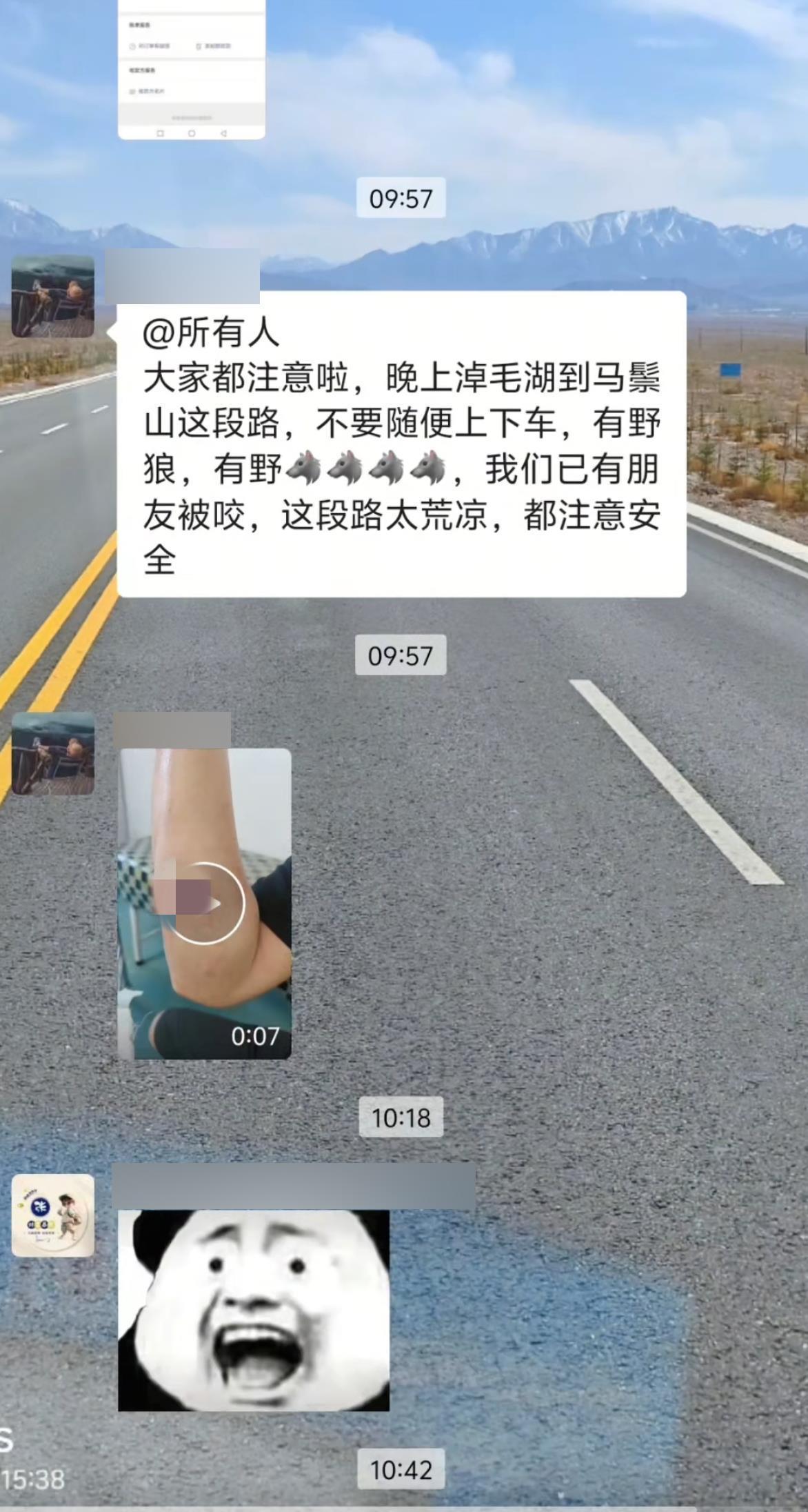 5月17日下午,在某卡友群内,有卡友提醒,走G331国道淖毛湖至马鬃山段,晚上千万别下车方便,有卡友被野狼给咬伤了。