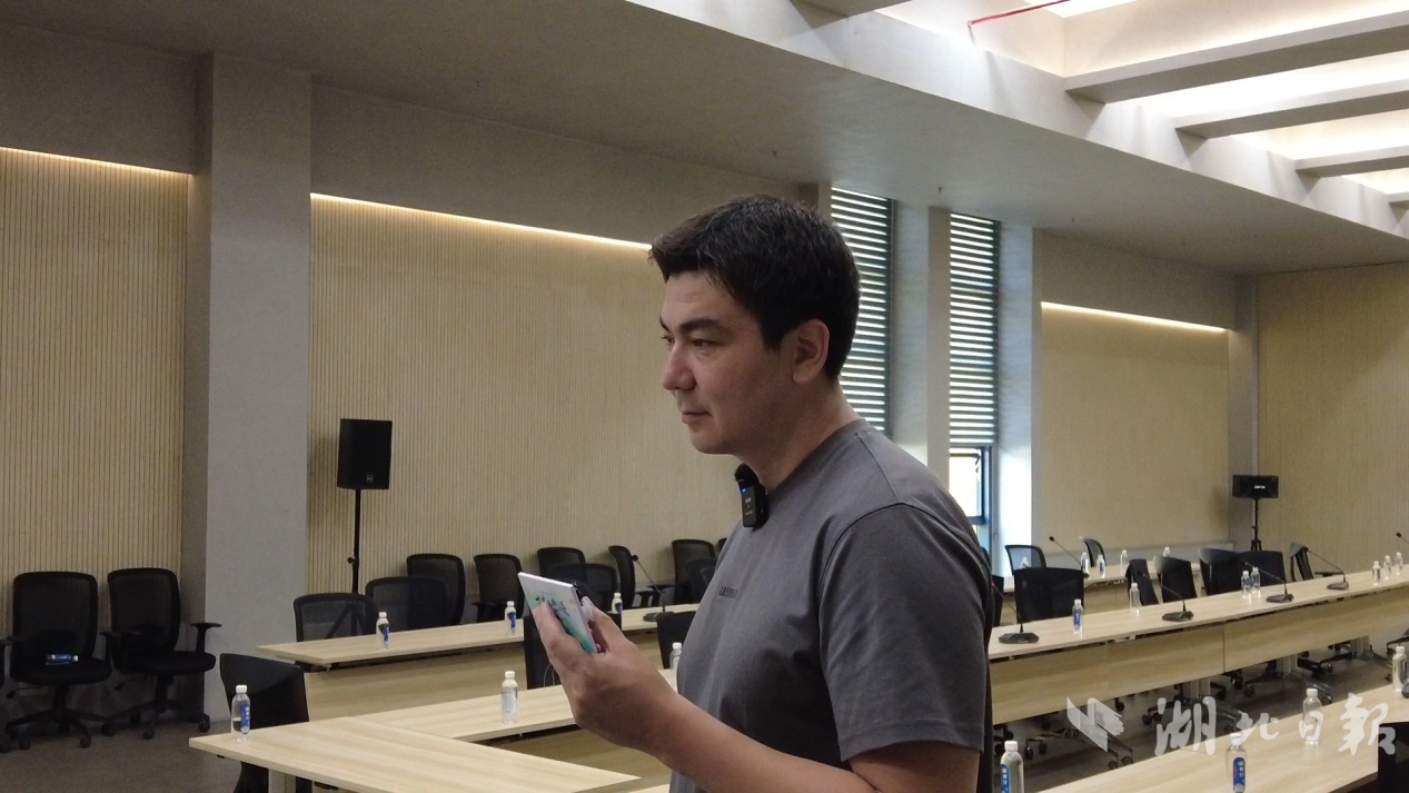 哈萨克斯坦头条新闻网记者、导演杜拉特·茹马加津接受采访。(湖北日报全媒记者 沈早慧/摄)