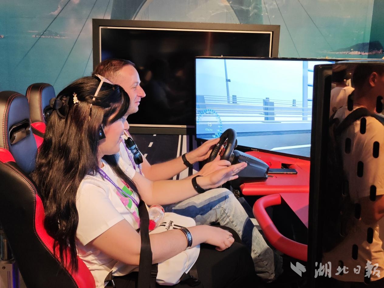 外媒记者在桥梁互动体验区体验在港珠澳大桥上“赛车”。(湖北日报全媒记者 沈早慧/摄)