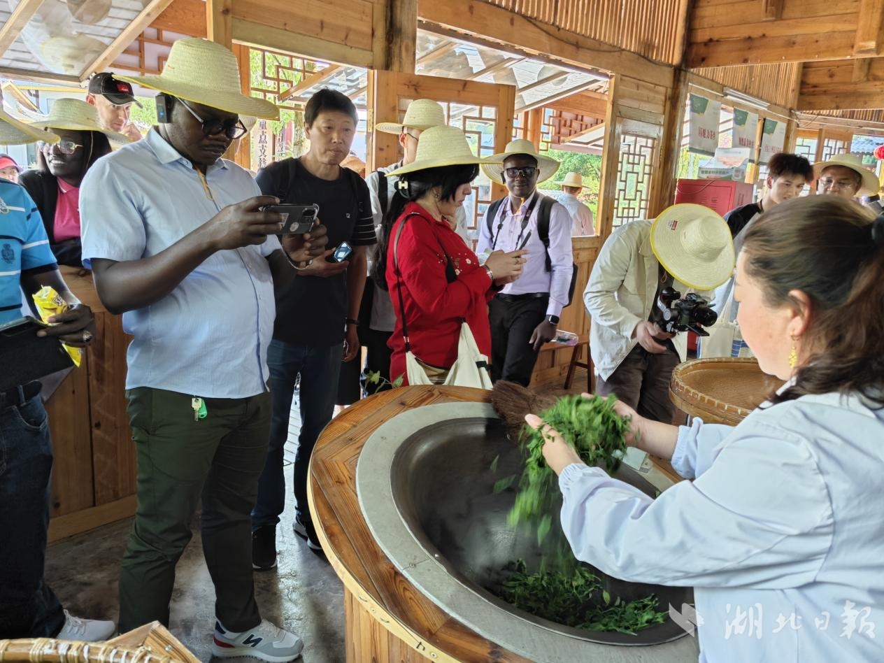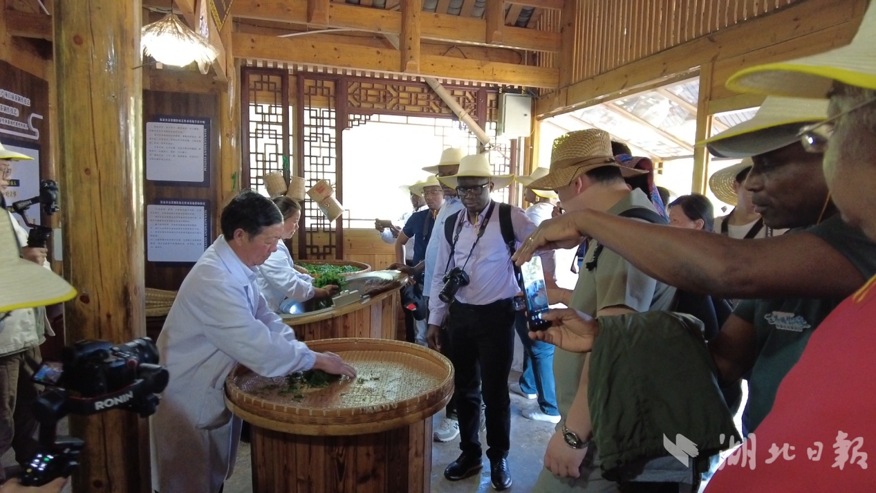 在伍家台村非遗传承基地,外媒记者们观看了制茶过程,烘干、揉捻……外媒记者们或拍摄记录,或上前嗅闻,有的还亲自上手,体验制茶手法。