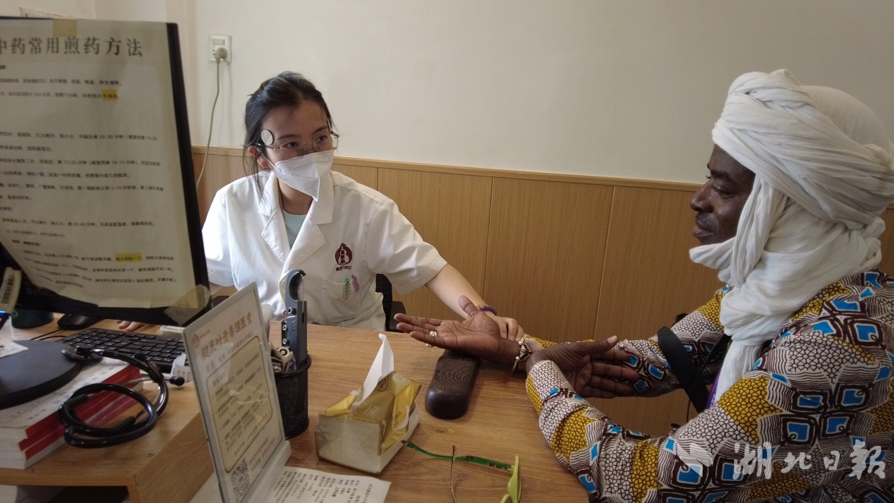 马里新闻广告社《发展报》加奥大区主管阿卜杜拉马内·图雷体验中医把脉看诊。(湖北日报全媒记者 沈早慧/摄)