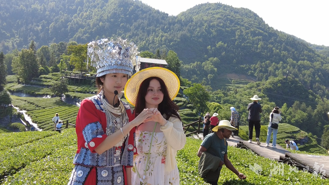 5月11日,25位外媒记者走进宣恩伍家台村,欣赏茶园美景,了解非遗制茶工艺。走进伍家台村茶园,漫山的茶树绘制出一幅别样的绿色美景。外媒记者们见状,纷纷合影留念。