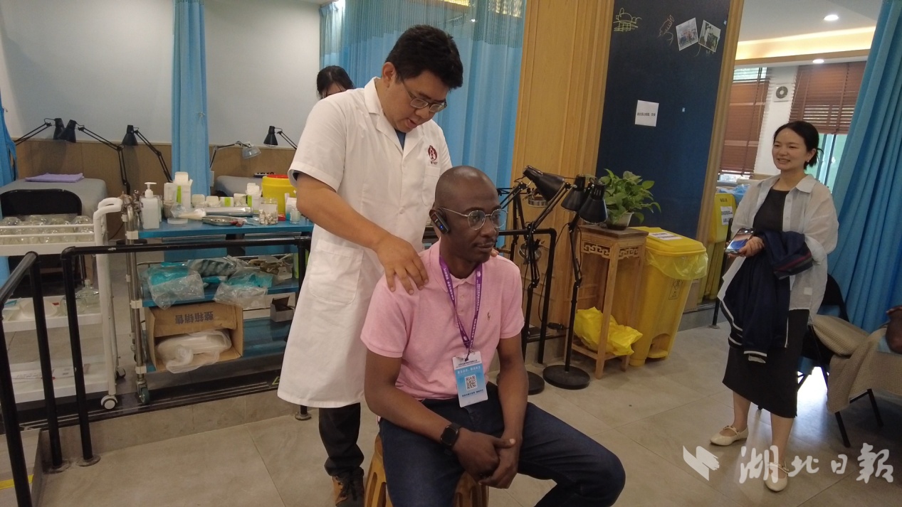 外媒记者体验中医正骨。(湖北日报全媒记者 沈早慧/摄)