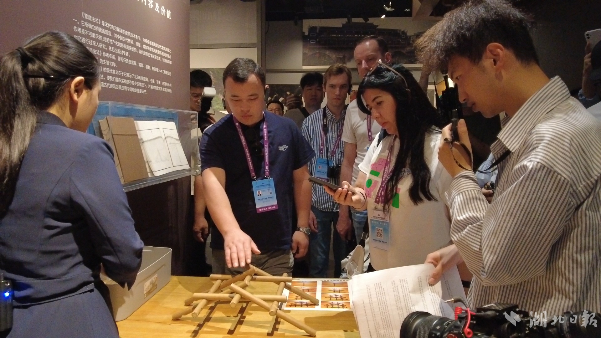 工作人员向外媒记者介绍搭桥原理。(湖北日报全媒记者 沈早慧/摄)