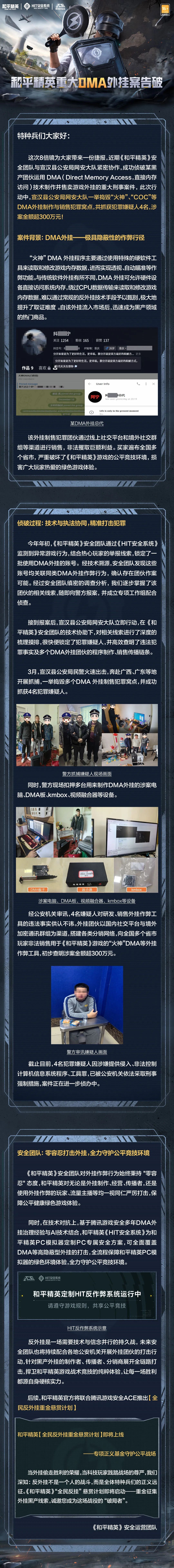 5月20日,腾讯游戏安全中心宣布《和平精英》重大DMA外挂案告破。