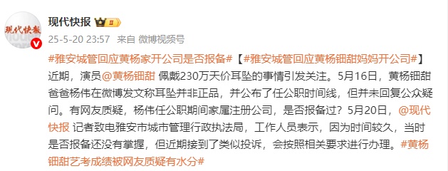 天眼查显示,杨伟关联的企业有三家,最早的一家为深圳市国影影视文化传播有限公司,成立日期2014年10月24日,注册资本500万元,目前的法定代表人为杨伟。虽然天眼查显示他是2017年6月1日才进入公司,但此前总经理为黄杨钿甜妈妈司玲霞。对此,有网友提出,公司注册时,黄杨爸爸在雅安市城市管理局执法支队任职,是公务员,公职人员家属开公司是否进行了报备?该企业经营范围是否与黄杨爸爸职权范围有关系,是否有违规行为?