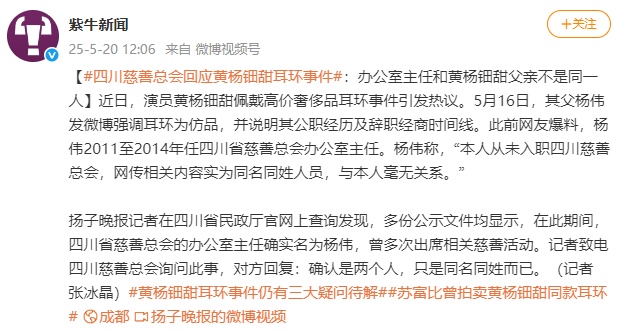 此外,还有消息称,黄杨钿甜的父亲杨伟2011至2014年任四川省慈善总会办公室主任,称其负责雅安地震灾后重建项目,怀疑其涉嫌侵吞灾后重建资金。对此,杨伟称,“本人从未入职四川慈善总会,网传相关内容实为同名同姓人员,与本人毫无关系。”