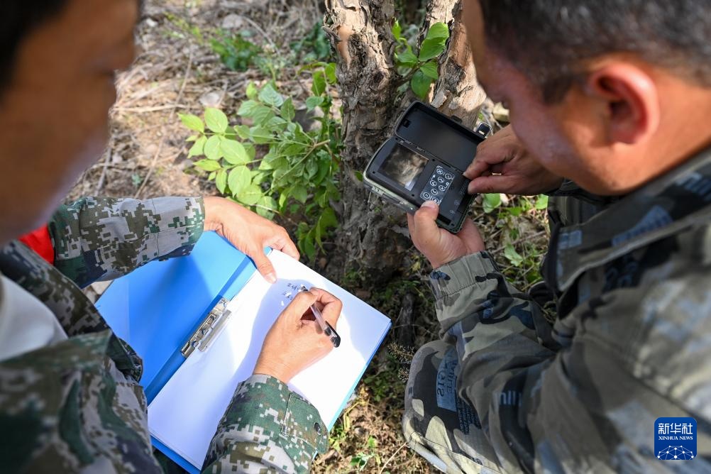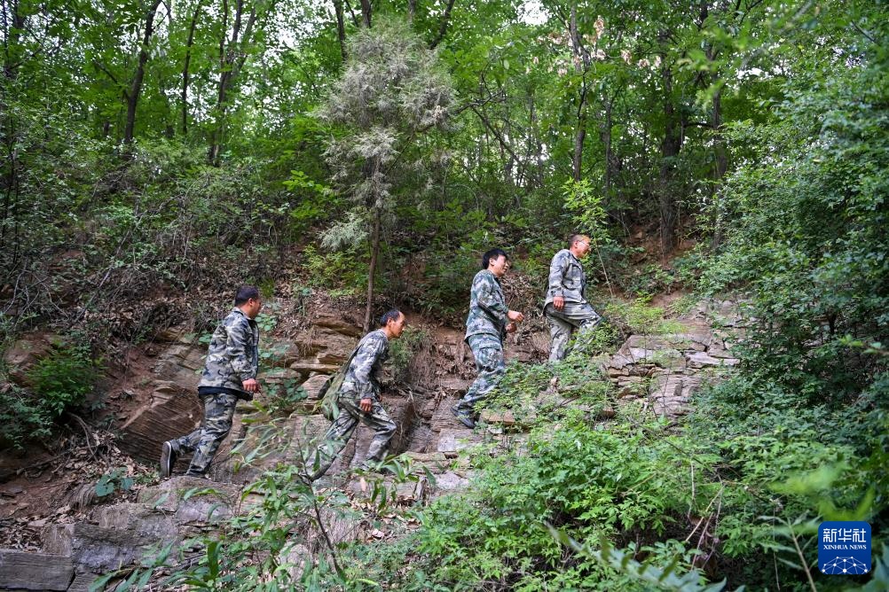 山西阳城蟒河猕猴国家级自然保护区管理局工作人员董建兵(左)和马少锋进行生物多样性调查(5月20日摄)。