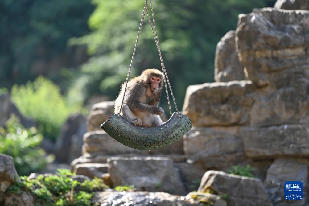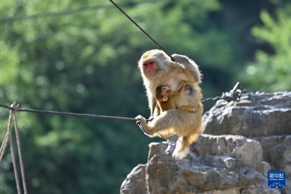 猕猴在山西阳城蟒河猕猴国家级自然保护区嬉戏(5月21日摄)。
