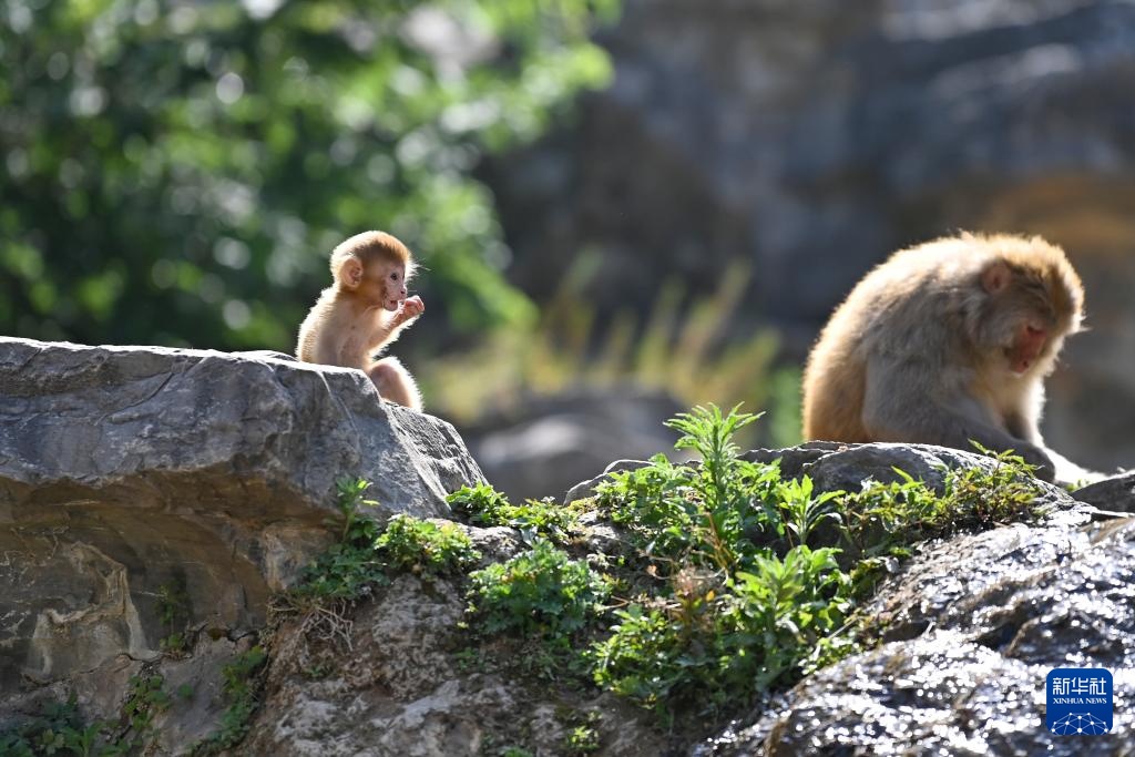 猕猴在山西阳城蟒河猕猴国家级自然保护区进食(5月21日摄)。