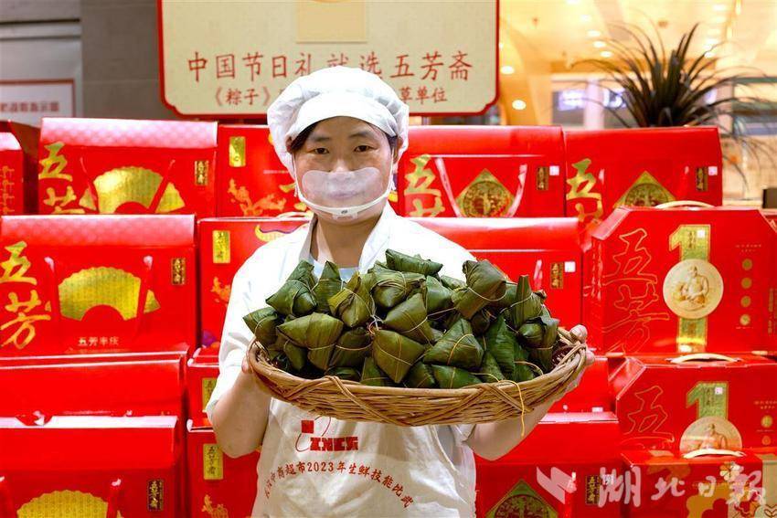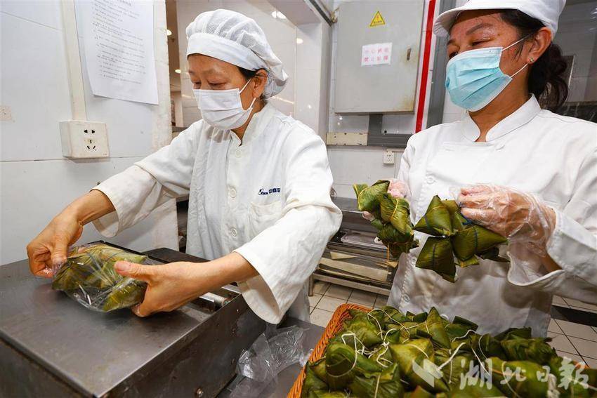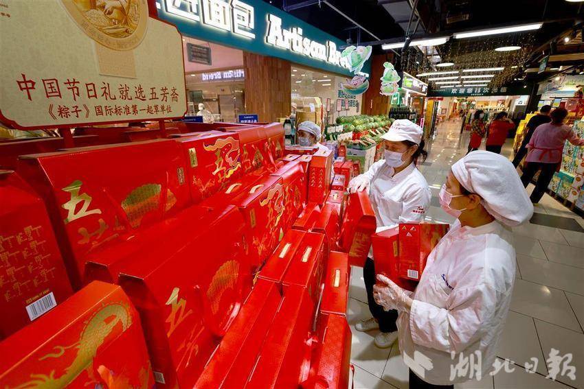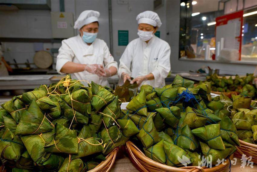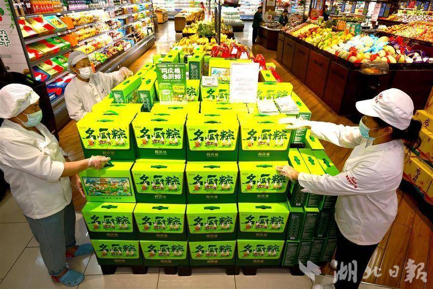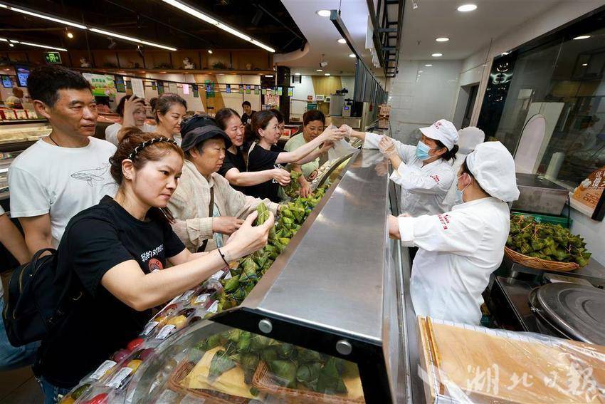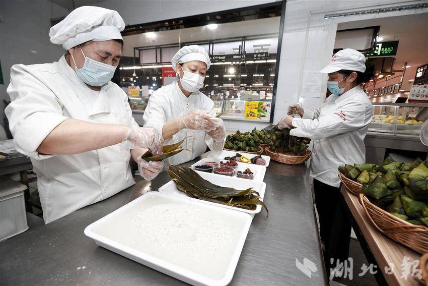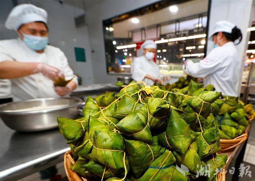 5月22日,武汉中商徐东平价广场内,碧绿的粽叶在员工指间翻飞,糯米与馅料被精准填入,细绳缠绕间,千余只手工粽子如艺术品般码放成山。随着蒸汽升腾,新鲜出锅的粽子引来市民争相选购。为迎接端午消费季,武汉各大商超加大生产和采购力度,全方位保障市场供应,让市民都能品尝到各种口味的新鲜粽子。近年来,随着端午节非遗技艺传承,越来越多市民青睐手工制作粽子,百年技艺正通过现代化品控在都市厨房焕发新生,让市民在粽香中触摸着传统文化的温度。(湖北日报全媒记者 魏铼 通讯员王莉摄)