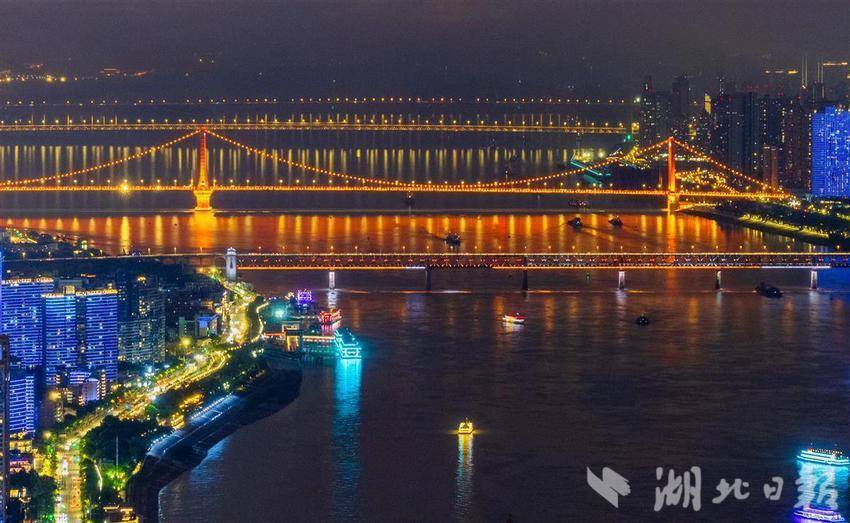 5月22日,航拍武汉长江大桥周边夜景。5月22日19时许,下了一天的暴雨暂时停歇,武汉市区空气清新通透。暴雨过后,在多部门的紧密配合下,武汉防汛应急工作井然有序,道路上积水消失,交通恢复正常。(湖北日报全媒记者 柯皓 摄)