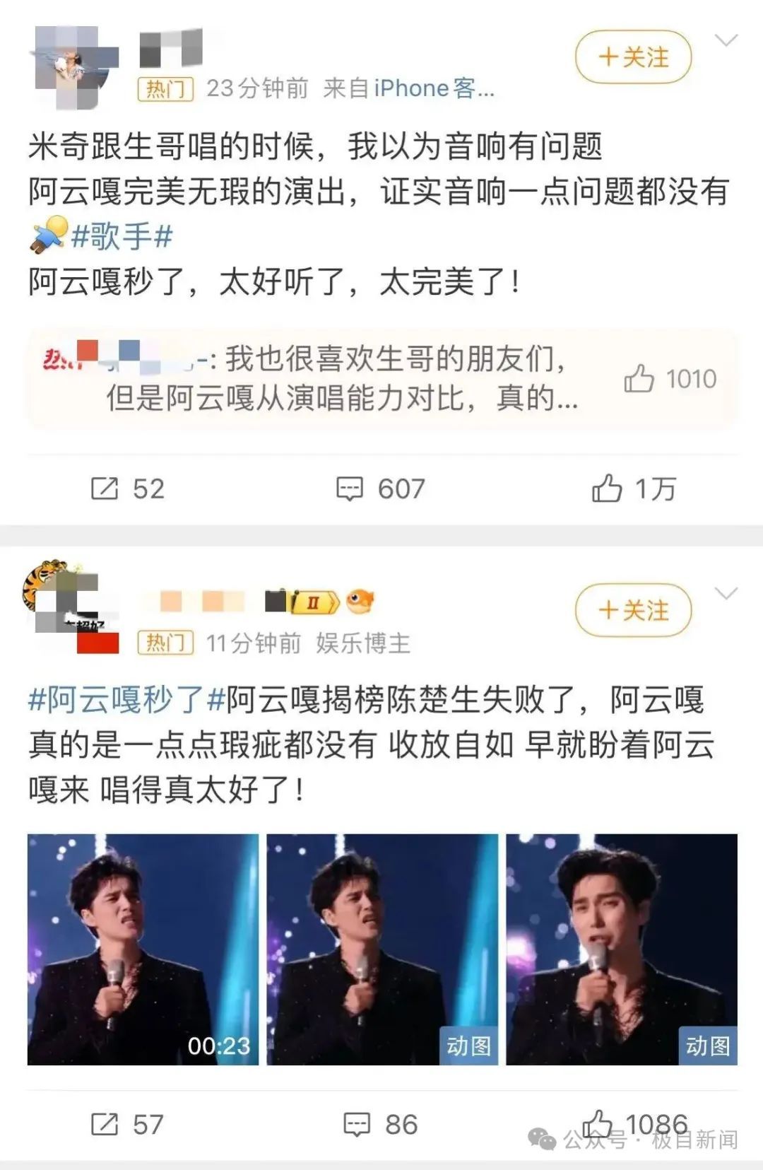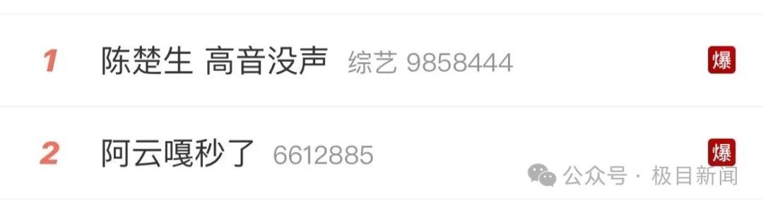 陈楚生、阿云嘎先后演唱,“陈楚生 高音没声”“阿云嘎秒了”的词条也相继登陆热搜,更分列微博热搜第一、二位,甚至同时成为“爆”搜,可见观众对两人比拼赛果的重视和讨论度。