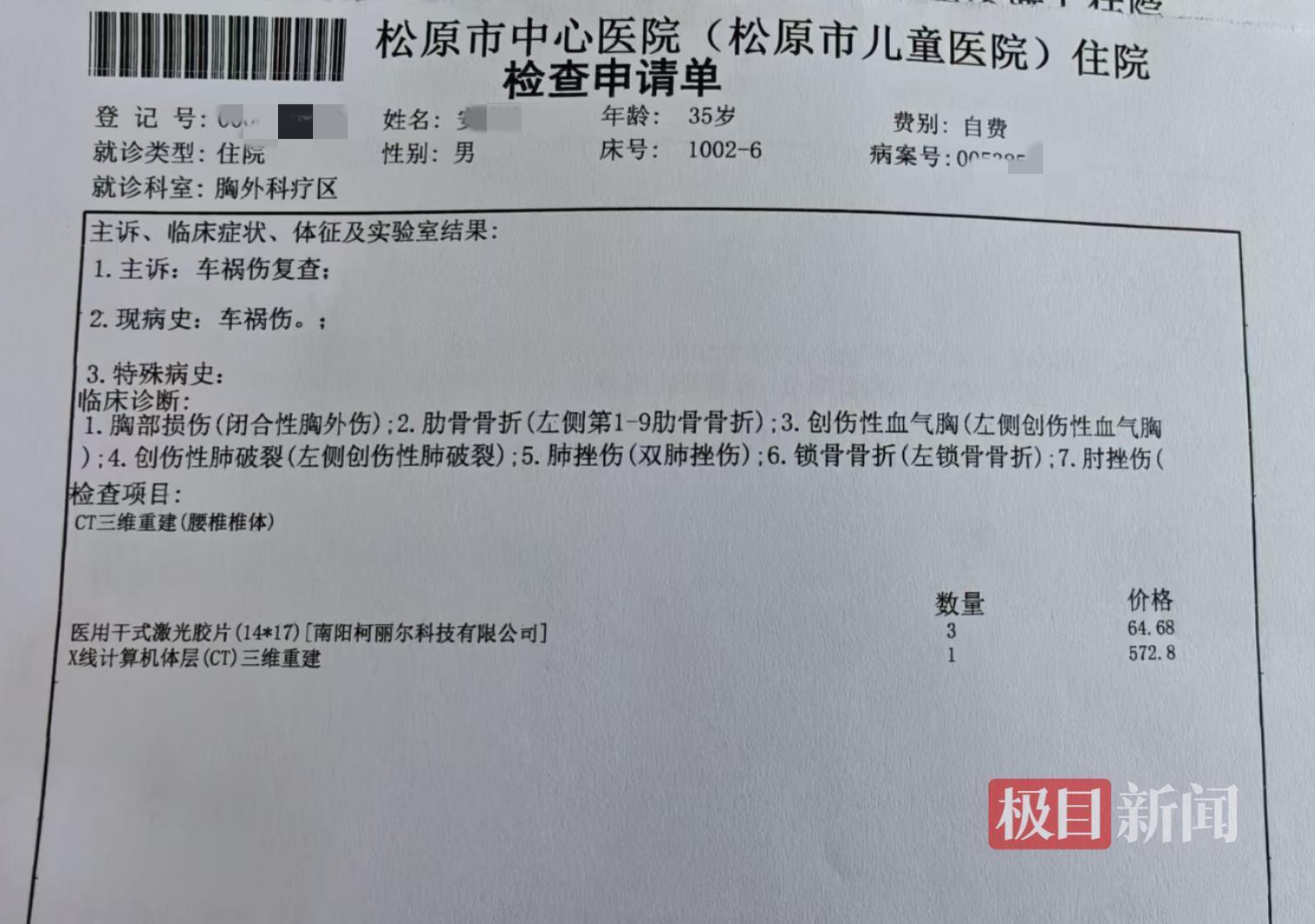 张先生提到,安某某被救护车送医救治,目前已从吉林松原市中心医院出院,回家休养,安某某可正常吃饭,但出行需要他人陪护。医院检查单据显示,安某某为车祸伤,临床诊断为胸部损伤、9根肋骨和左锁骨骨折。他说,安某某的肺部可能还有些问题。