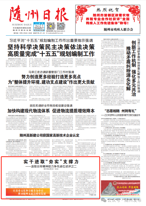 我们要把实干的责任扛在肩上,把实干的行动落实在具体工作中,紧紧围绕市委、市政府的中心工作,厘清自身高质量发展的关键着力点,在重大改革、重大项目、重点工作、重大民生、重大活动等任务中用真功、鼓实劲,求突破,推动强基和扩能“双轮驱动”,推动科创和产业“双向奔赴”,推动外贸和内销“两端发力”,推动生态和文旅“互促并进”,全力打造一流的营商环境和城乡环境,为全省“支点建设”作出更多随州贡献。