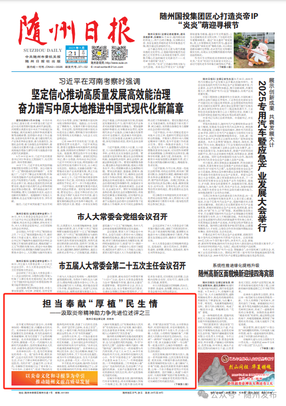 从炎帝神农“为民造福”的远古实践,到随州“共享发展”的现代探索,跨越五千年的精神火炬始终照亮随州的前行之路。我们要继续以炎帝精神为指引,厚植为民情怀,彰显民生温度,在高质量发展中书写争先进位的新篇章,让“发展成果人民共享”的理念在炎帝故里这片土地上绽放更加璀璨的光芒。