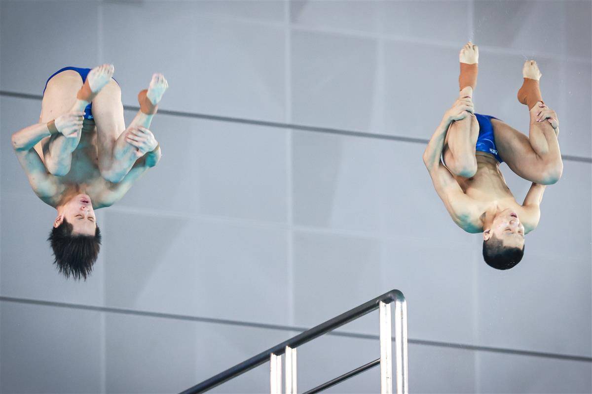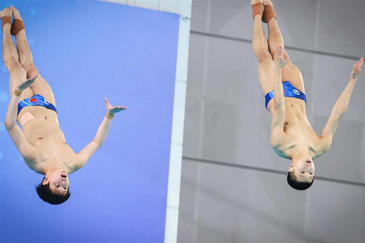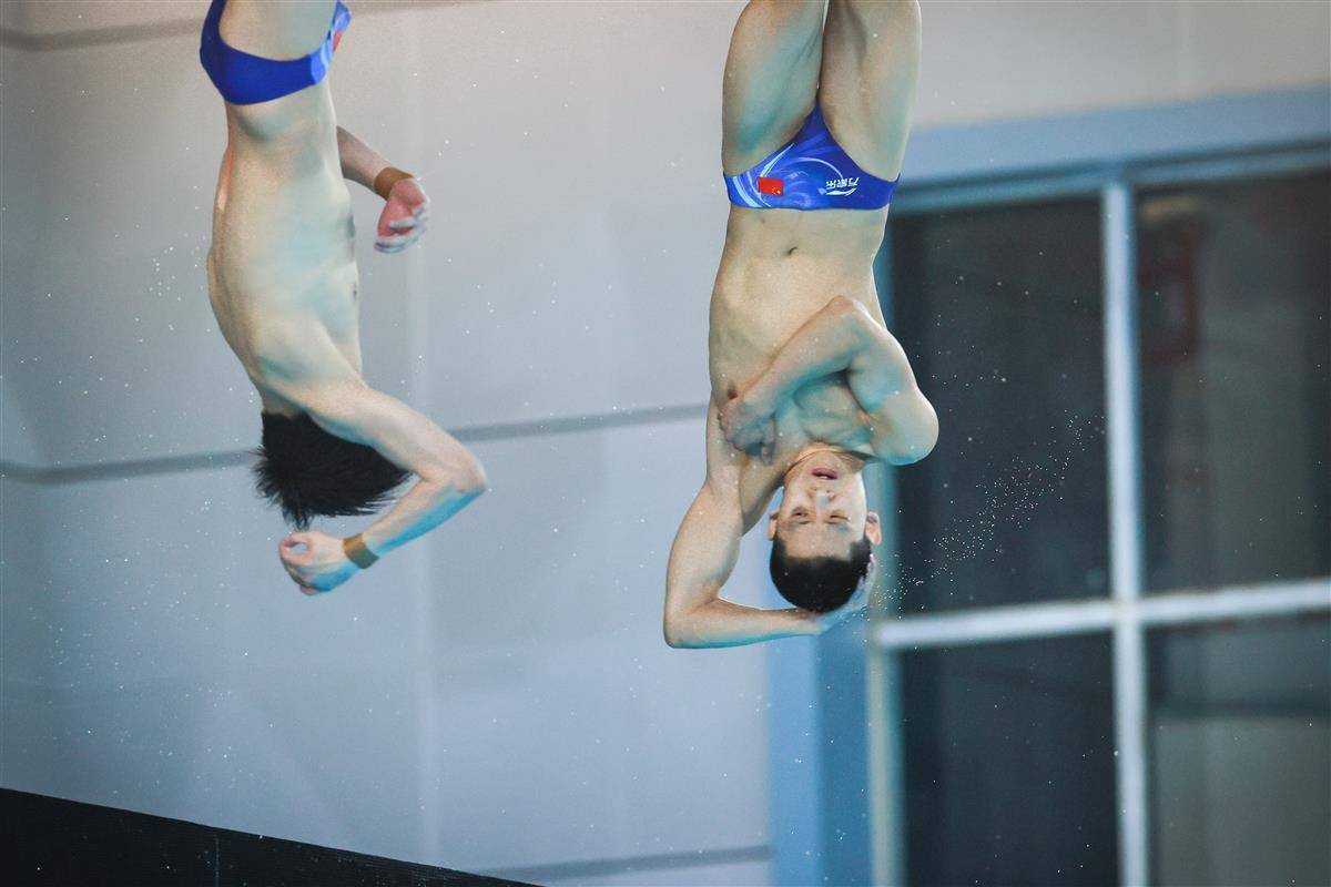 5月24日,2025年全国跳水冠军赛暨新加坡世锦赛选拔赛、全运会跳水项目资格赛在武汉体育中心游泳跳水馆揭幕,并在男子双人10米台产生首枚金牌。湖北19岁小将程子龙携手国家队队友、广东选手朱子锋以421.89分加冕,为代表中国队出战新加坡世锦赛增添砝码。(湖北日报全媒记者 时龚 摄)