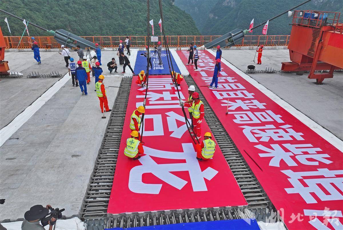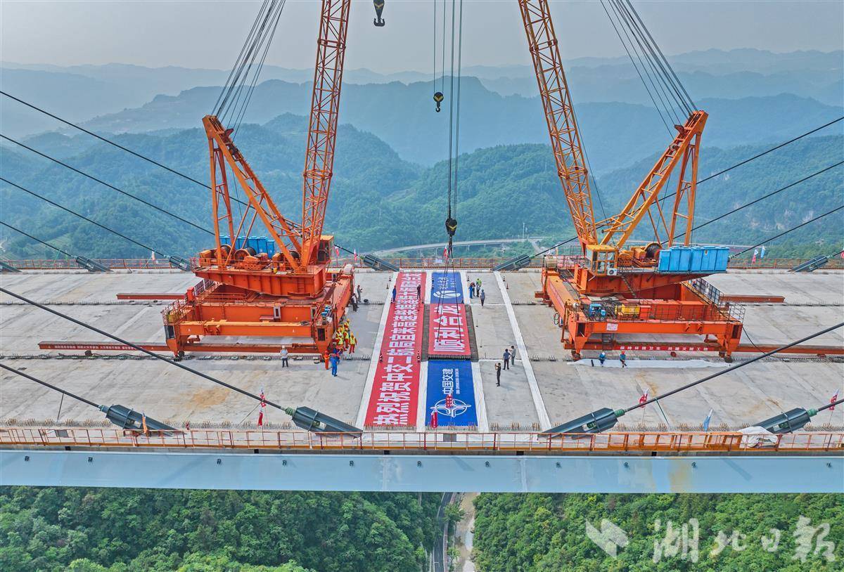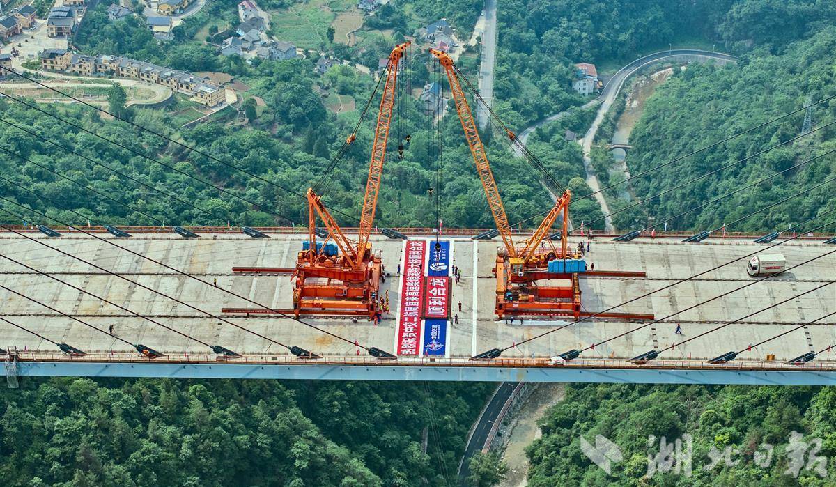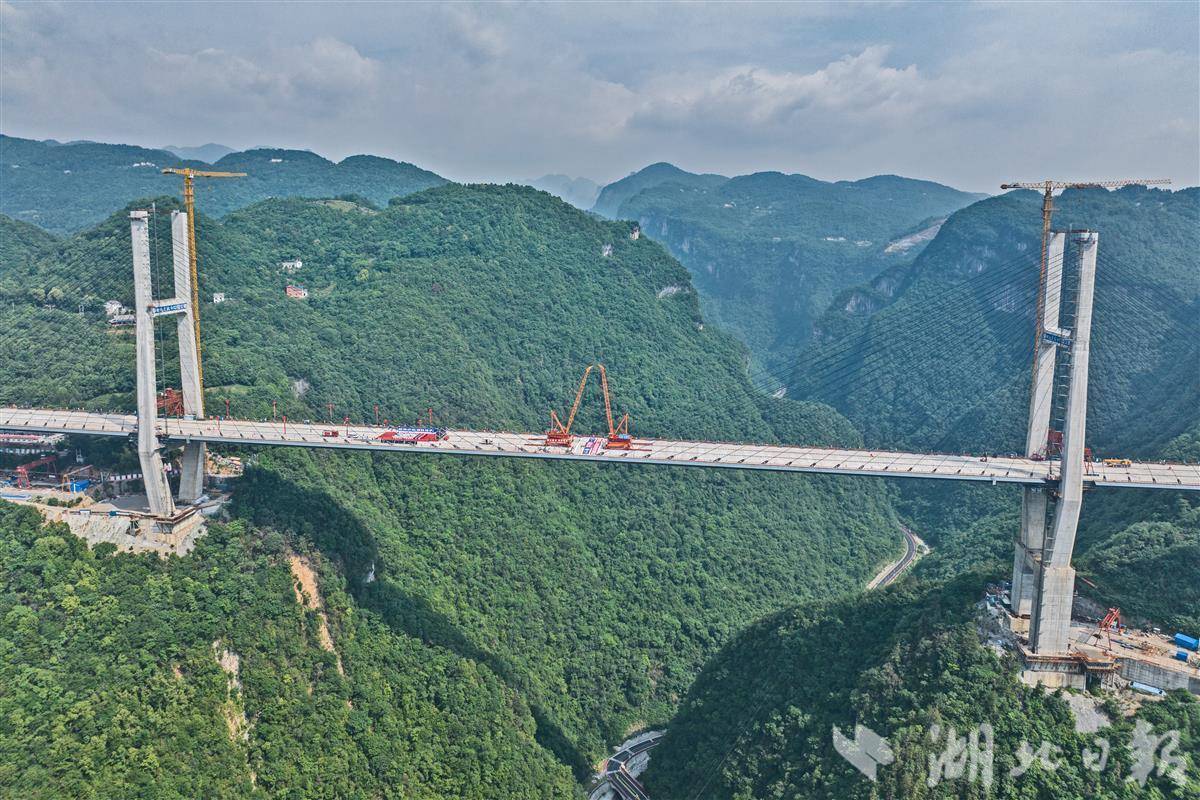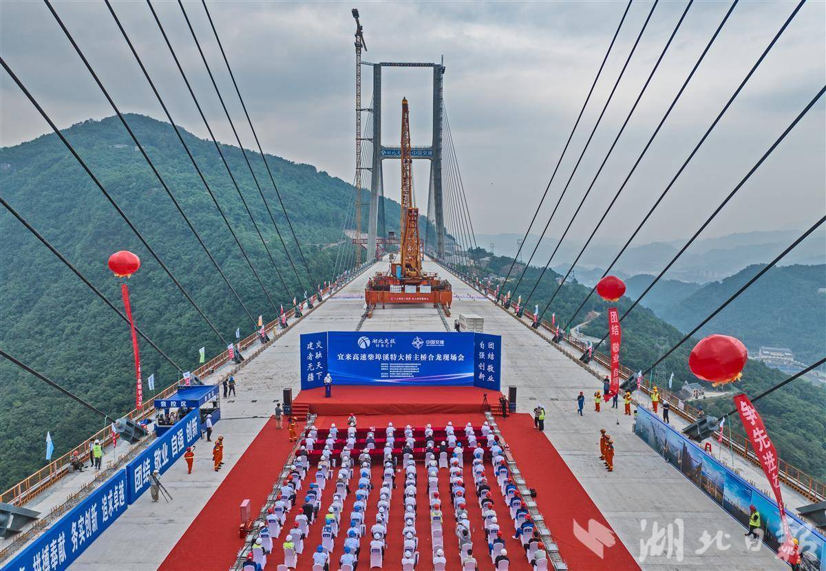 5月25日,五峰土家族自治县宜来高速柴埠溪特大桥顺利合龙。该桥是湖北省首座省道与高速同层共建斜拉桥,也是世界最宽双边工字钢组合梁斜拉桥,主桥长904米,主跨480米,桥面宽44.5米,是世界最宽双边工字钢组合梁斜拉桥。为服务少数民族地区经济发展,柴埠溪特大桥多花了1.8亿元,采用了省道和高速公路同层共建的结构形式,预留了10.25米宽的省道通行功能。面对“二合一”结构的高难度挑战,建设团队以152根斜拉索等构件完成施工,首创“对角异侧自平衡合龙法”实现毫米级精准合龙。同时,项目践行环保理念,采取分级开挖等措施保护生态。大桥横跨柴埠溪大峡谷,建成后将惠及五峰土家族自治县16万亩茶园与数十万茶农,对推动茶旅融合、促进少数民族地区经济协作意义重大。(湖北日报全媒记者刘曙松通讯员王登府摄)