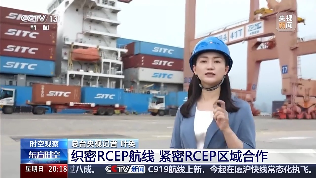 总台央视记者 叶奂:我身后的这艘集装箱船执行的就是今年3月新增的一条RCEP航线。今天启航,3天后即可抵达菲律宾的伊洛伊洛港。